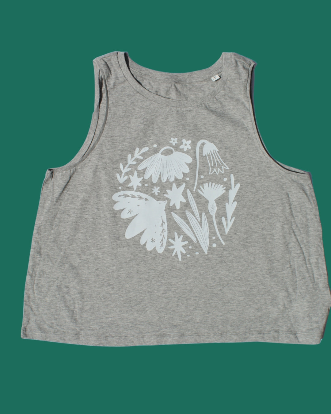 A lovely soft heather grey or dark charcoal grey vest, slightly cropped with a white bird/foliage design.