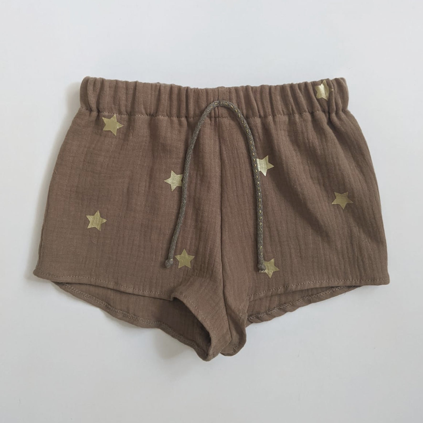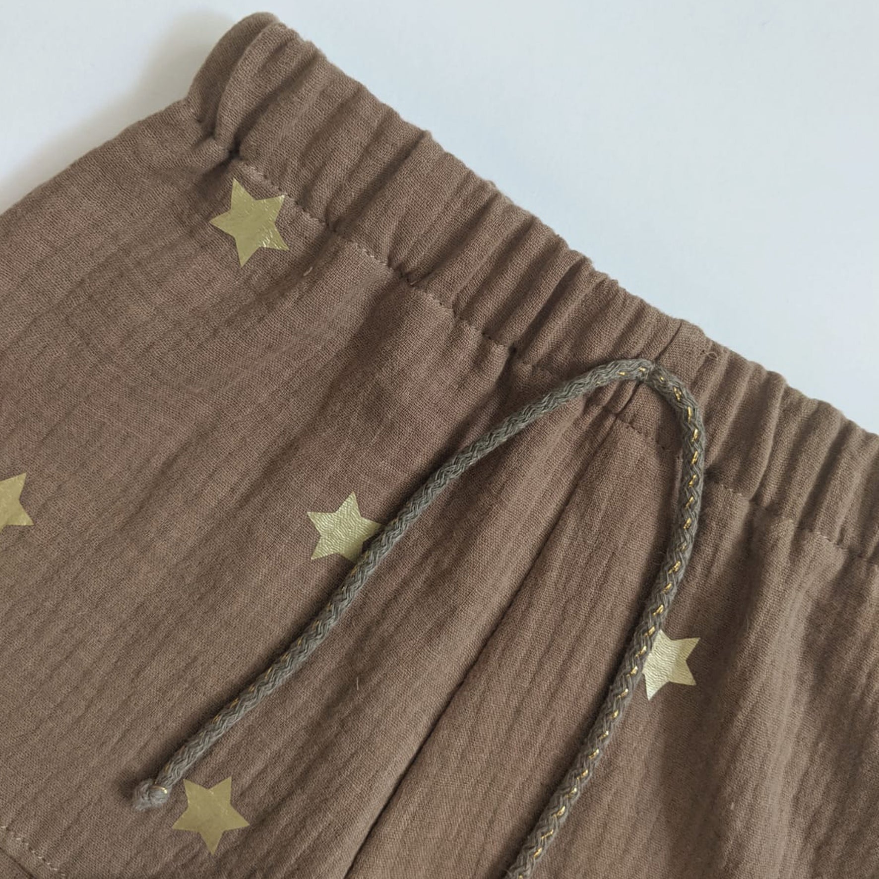 These SUPER-CUTE Gold Star Shorts in Sand with Gold Cording are Sustainable and Ethically made with double gauze muslin. We hand make them at our home in North Yorkshire, England.
