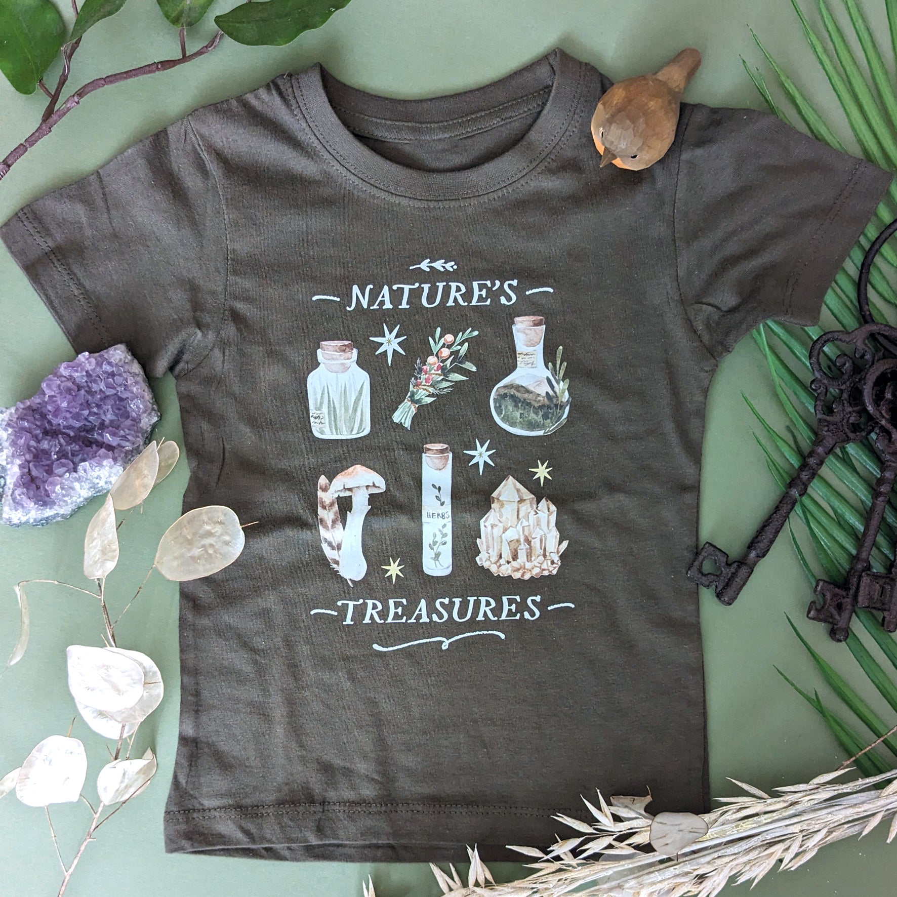 A lovely soft cotton olive/khaki tee with Nature's treasures design.