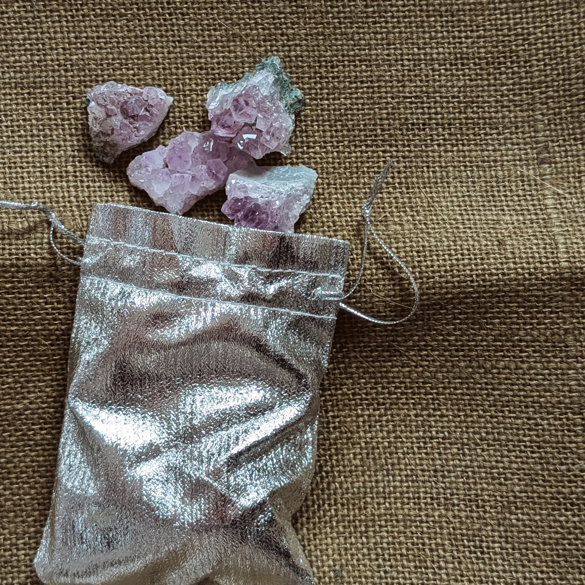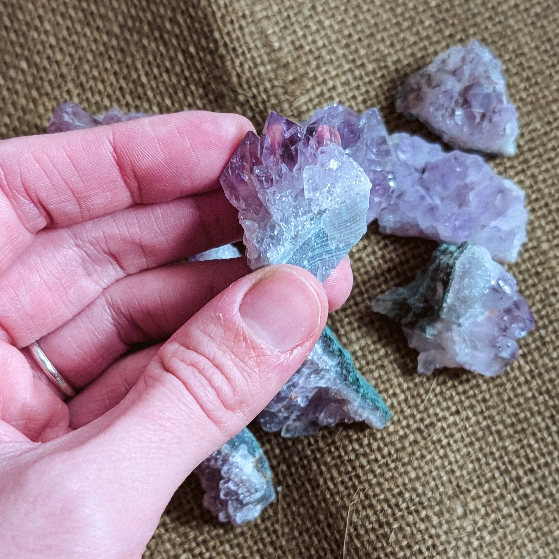 Contains approx 10 pieces of various sized raw Amethyst clusters.
